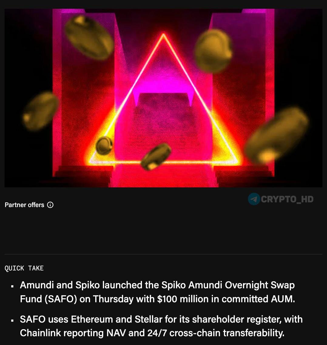 🎉🇪🇺 Компания Amundi запустила токенизированный фонд на $100,000,000 на блокчейнах Ethereum и Stellar. Amundi – крупнейший европейский управляющий активами. AUM = $2,300,000,000,000+. Фонд SAFO использует Ethereum и Stellar для ведения реестра акционеров, а Chainlink (#LINK) предоставляет данные о чистой стоимости активов и обеспечивает круглосуточную возможность перевода активов между блокчейнами. Crypto Headlines