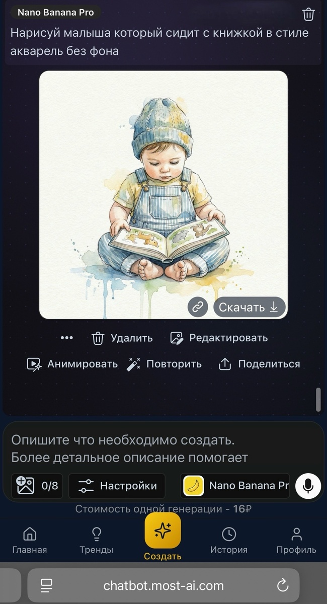 Стоимость одной генерации – 16 рублей.