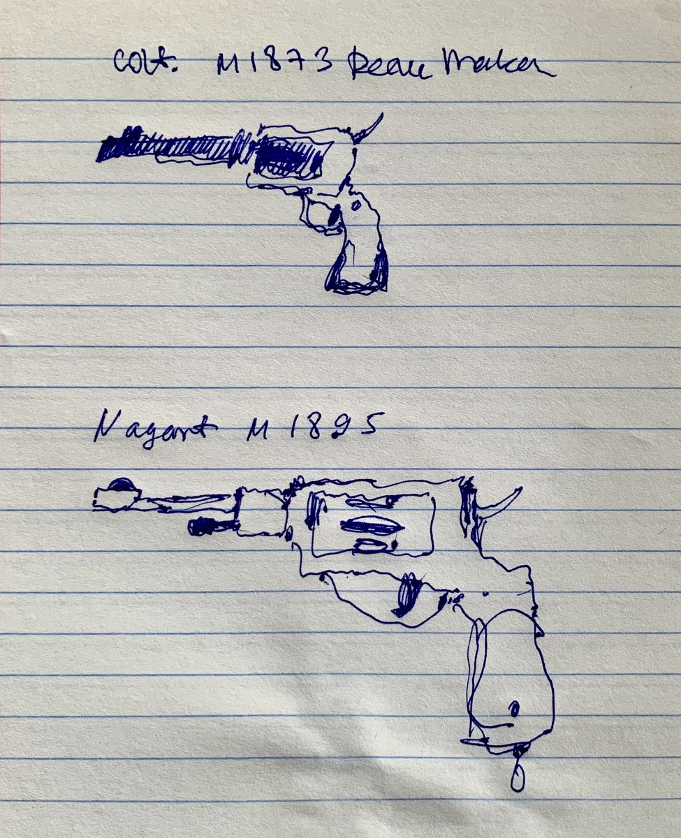 Револьверы Кольт и Наган конца девятнадцатого века. Тогда и оружие было изящным. Я редко рисую оружие и если рисую, то это чаще холодное оружие: ножи, шпаги, сабли и мечи. Пистолеты подробно, пусть и криво, вообще рисую впервые. Как-то давно нарисовала очень схематично пистолет, принадлежащий одному из моих персонажей — актрисе и одновременно с тем сыщице. Действие происходило в 20-х годах ХХ века. Все как я люблю %-) Но сыщица тоже сидела все время в моей голове и разок вышла на бумагу. О ней давно ничего не придумывала. Но вот теперь револьверы собственной персоной. Косоваты, конечно. И это мягко сказано. Но что делать? %-)