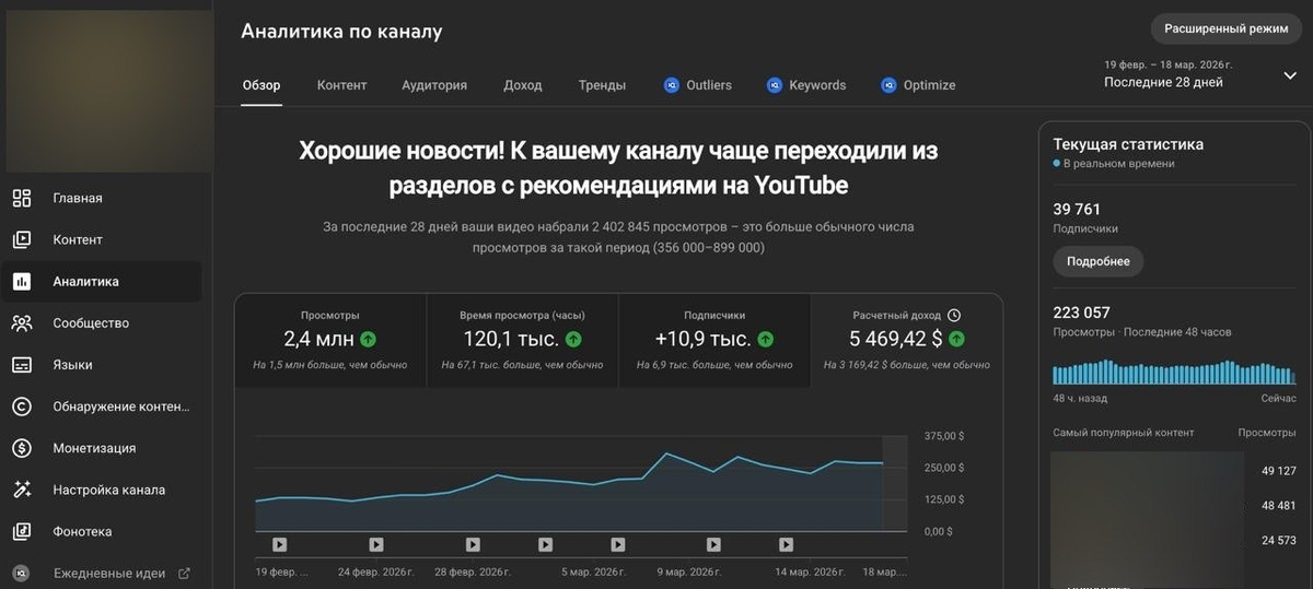 ! 👋 Почему YouTube остается крутой возможностью для заработка денег? 🤔 YouTube предоставляет уникальные возможности для заработка, которые сложно найти в других инструментах. Вот почему: - Гибкость и контроль 🏠 Вы работаете из дома. - Анонимность 👤 Вам не нужно показывать свое лицо. - Глобальная аудитория 🌍 Смотрят со всего мира. - Валютный доход 💰 Доход в иностранной валюте. - Свобода от офиса 🚀 Забудьте о поездках на работу. - Финансовая независимость 💸 Доход позволяет комфортно жить и строить планы на будущее. Авторы зарабатывают хорошие 🚀 На скриншоте видно, что за месяц было выложено всего 7 видео, а доход составил 5500$. 🤑 Представьте: вы просыпаетесь, а на счету уже 300$. Разве это не кайф? 😍 Весна пришла, а значит, время новых возможностей! 🌸 Ниша кулинарии циклична, и весенние каналы всегда хорошо стартовали🍲 Пишите нам в бот. Там вы найдете всю необходимую информацию. ✍️ А те, кто пока наблюдает, ставьте 🔥, чтобы поддержать ребят! 👉 https://t.me/orobe
