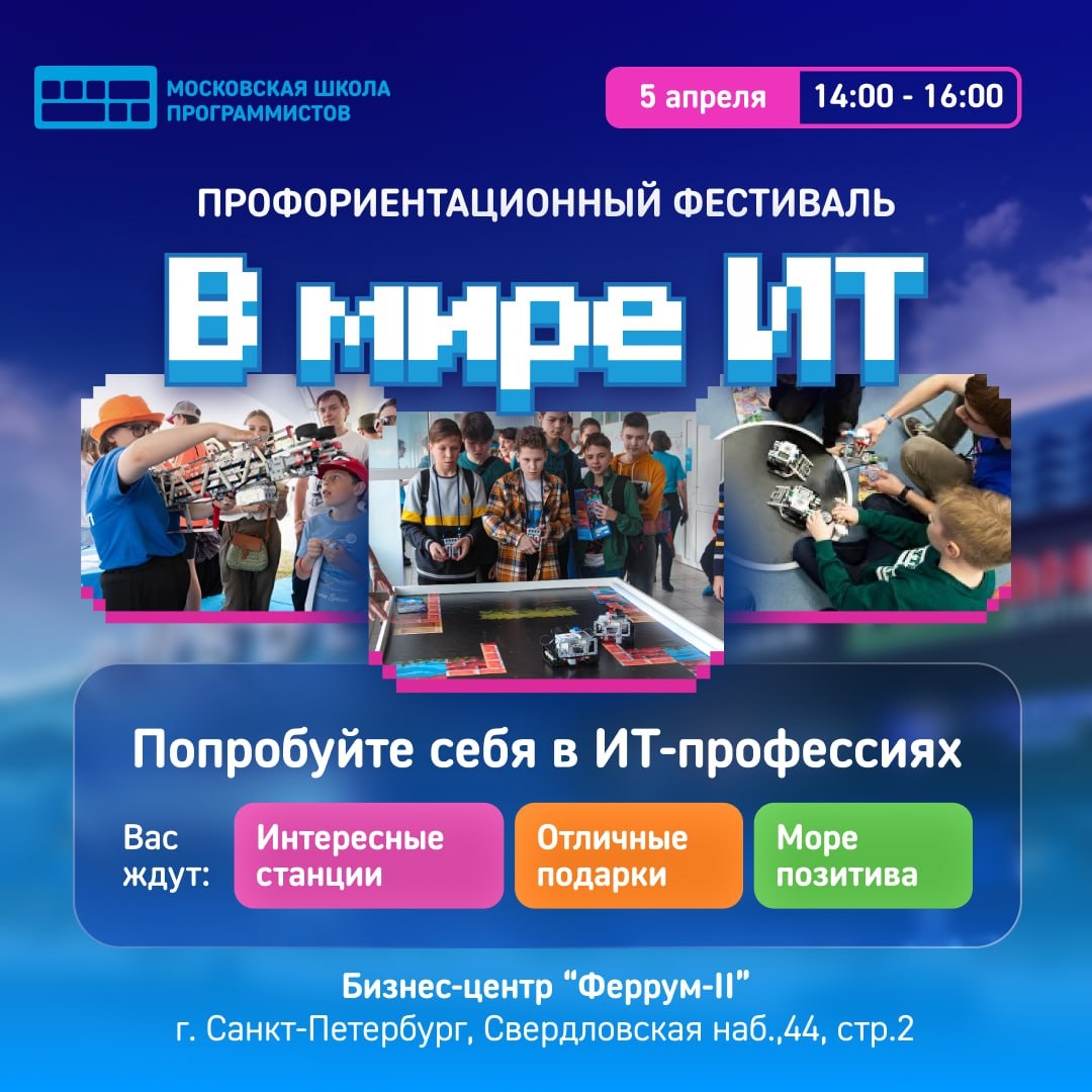 5 апреля Школа программистов МШП в Санкт-Петербурге приглашает школьников 1-10 классов и их родителей на профориентационный ИТ-фестиваль «В