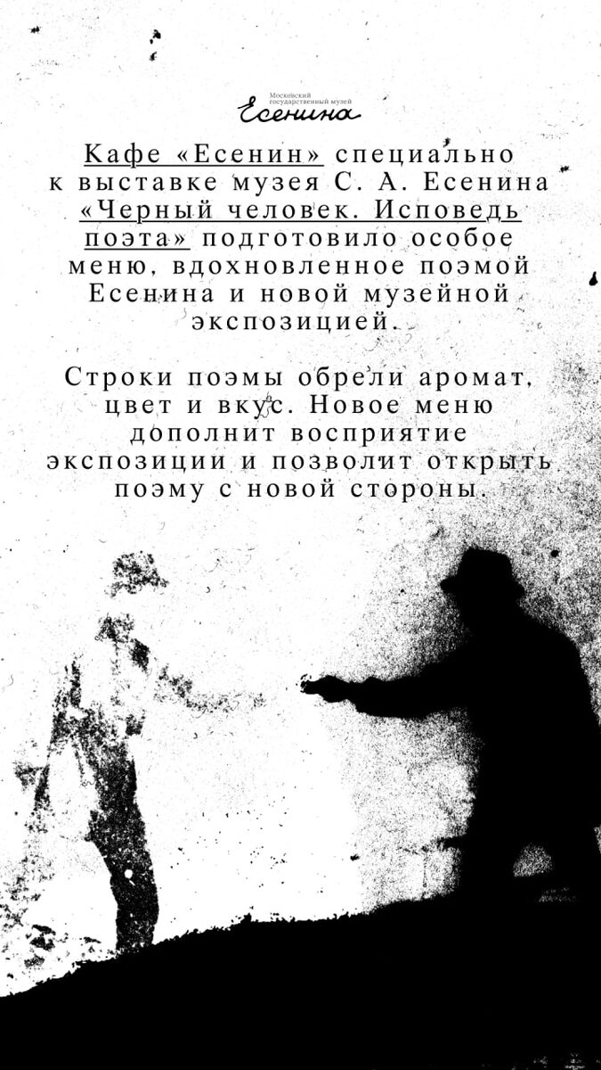☕️ К выставке «Чёрный человек. Исповедь поэта» музейное кафе «Есенин» представило новое тематическое меню, вдохновлённое одноимённой поэмой и её атмосферой. В нём — авторские чаи, кофейные напитки и десерты, каждый из которых отражает образы и контрасты есенинского мира. Подробнее читайте в карточках. Ждем вас в Есенин-центре! 📍переулок Чернышевского 4с2 @esenin_mosmuseum