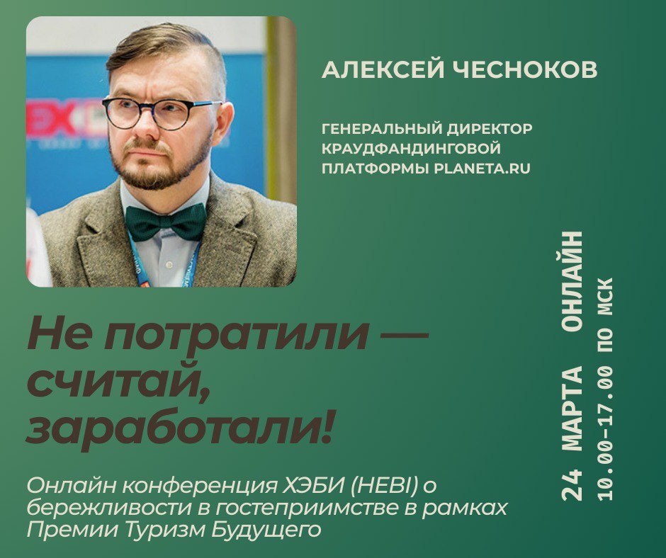 24 марта на бесплатной онлайн-конференции HEBI «Не потратили — считай, заработали!» выступит Алексей Чесноков, генеральный директор краудфандинговой экосистемы Planeta.ru. Алексей расскажет: Ключевое место в выступлении займут кейсы успешных (и не очень) проектов, связанных с туризмом, а также этапы подготовки эффективной крауд-кампании. Краудфандинг – это не «попросить денег». Это способ проверить идею, собрать первых амбассадоров и запустить проект с минимальными собственными вложениями. Кому будет полезно? «Мы видим, как проекты из регионов задают новые тенденции в туристическом бизнесе. Хочется поделиться этими инсайтами с теми, кто тоже готов пробовать новые пути», – отметил генеральный директор Planeta.ru Алексей Чесноков Зарегистрироваться на конференцию можно по ссылке.