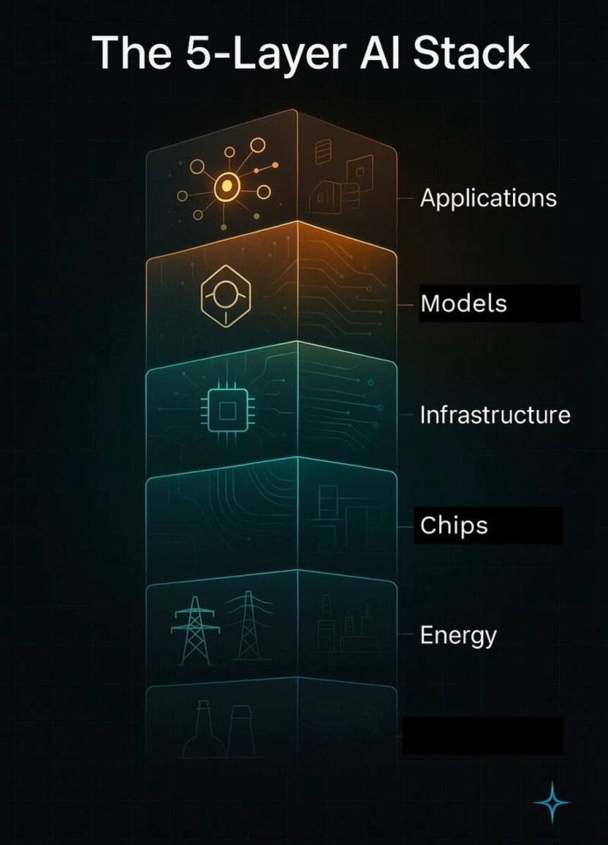 Это пятислойная индустрия на триллионы долларов Инвесторы часто смотрят на ИИ через призму приложений: ChatGPT, Midjourney, Perplexity, различные AI-агенты. Но если копнуть глубже, становится очевидно: реальная экономика ИИ устроена совсем иначе. Один из самых точных разборов этого дал инвестор Anish Moonka, описав пятислойный AI-стек — инфраструктуру, на которой строится вся индустрия. И самое интересное — основные деньги сейчас текут не туда, где все смотрят. 1. Energy — энергия Самый базовый слой всей системы. ИИ-модели требуют колоссального количества электричества для обучения и инференса. Главный риск ближайших лет — банальный дефицит энергии. Поэтому сейчас происходят процессы, о которых почти не говорят: • строительство новых электростанций • развитие малых ядерных реакторов (SMR) • геотермальные проекты • газовые турбины • долгосрочные контракты на электроэнергию (PPA) Гиперскейлеры уже резервируют десятки гигаватт мощности на годы вперёд. Фактически ИИ начинает пер