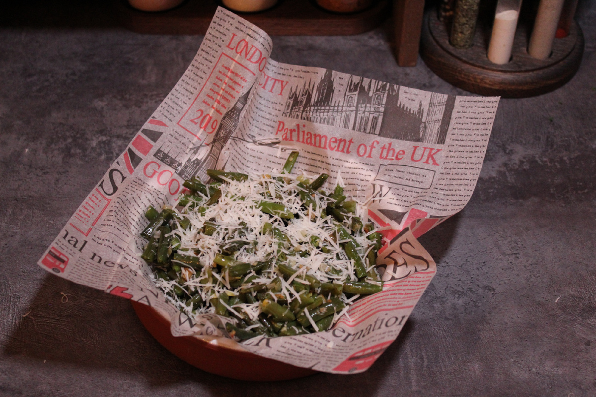 Зелёная стручковая фасоль - 400 гр. Чеснок - 3 зубчика Лук - 1 шт. Растительное масло - 2 ст. л. Соль и перец по вкусу Мелко рубим чеснок и лук и отправляем в ёмкость к фасоли. Добавляем масло, специи и хорошенько перемешиваем. Ставим запекать при 180 градусах на 20 минут. При подаче можно посыпать тертым сыром. Приятного аппетита!