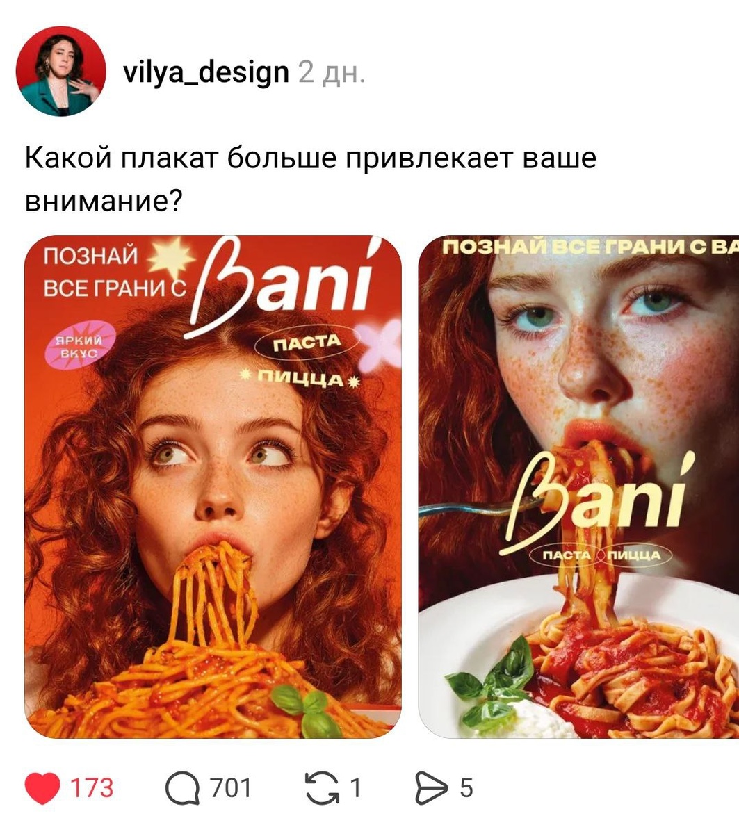 Пока Карина готовит нам аудит для Сикварули, я поделюсь нашей крайней работой. Смотрели мультик «Лесная братва»? Там был енот, который объяснял животным любовь людей к еде: «Мы едим, чтобы жить, а они живут, чтобы есть» 🤣 Да, для людей еда давно перестала быть просто энергией для жизни. Это эмоции, ощущения, новые вкусы, эксперименты, желания, опыт, досуг, общение, встреча с друзьями, коллегами, свидание, праздник! 😍 все что угодно, но не просто еда. Вот и мы создали для Bani плакат на фудкорт, который будет вызывать эмоции. Даже пост в тредс (запрещен на территории РФ) набрал у меня 60к просмотров и 700 комментариев! потому что люди не смогли пройти мимо, этот плакат притягивает взгляд ❤️ и вызывает эмоции. Не всегда положительные, но главное, что не равнодушие. Заказать дизайн не как у всех @vilya_menu