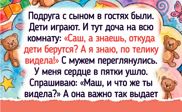 - Подруга с сыном в гостях были. Дети играют. И тут доча на всю комнату: «Саш, а знаешь, откуда дети берутся? А я знаю, по телику видела!» С мужем переглянулись. У меня сердце в пятки ушло. Спрашиваю: «Маш, и что же ты видела?» А она важно так выдает: «Там надо обязательно целоваться! Мам, мы с тобой смотрели. Мне тогда папа глаза закрыл, но я все равно увидела». И смотрим таким хитрым, довольным взглядом. Выдохнули. Оказалось, у нее сработала «киношная» логика: в фильмах же как — сначала поцелуй, потом кадр меняется, и бац — уже ребенок на руках.