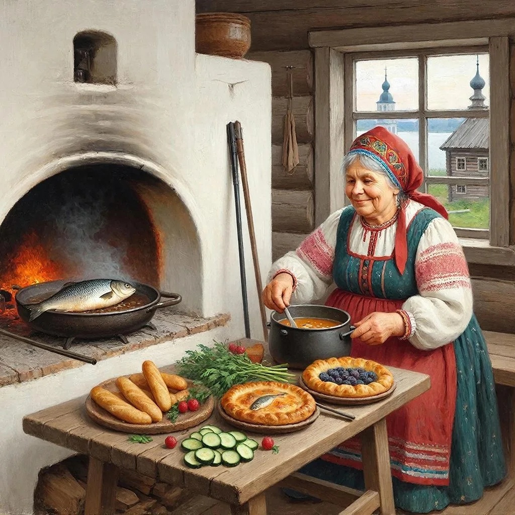 - Хлебные изделия: Хлеб выпекался вручную в русских печах и являлся основным продуктом питания крестьянских семей.