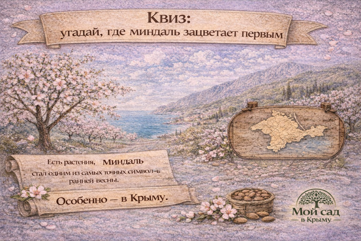 А есть те, кто не ждёт. Миндаль — из второй категории. Он не подстраивается под даты, не ориентируется на «официальную весну» и не спрашивает, готовы ли мы к смене сезона. В тёплых регионах он начинает цвести очень рано — иногда ещё тогда, когда зима формально не закончилась. И именно поэтому миндаль стал одним из самых точных символов ранней весны. Особенно — в Крыму. Где миндаль может зацветать уже в феврале? Попробуй ответить интуитивно: Если говорить честно — правильных ответов два: