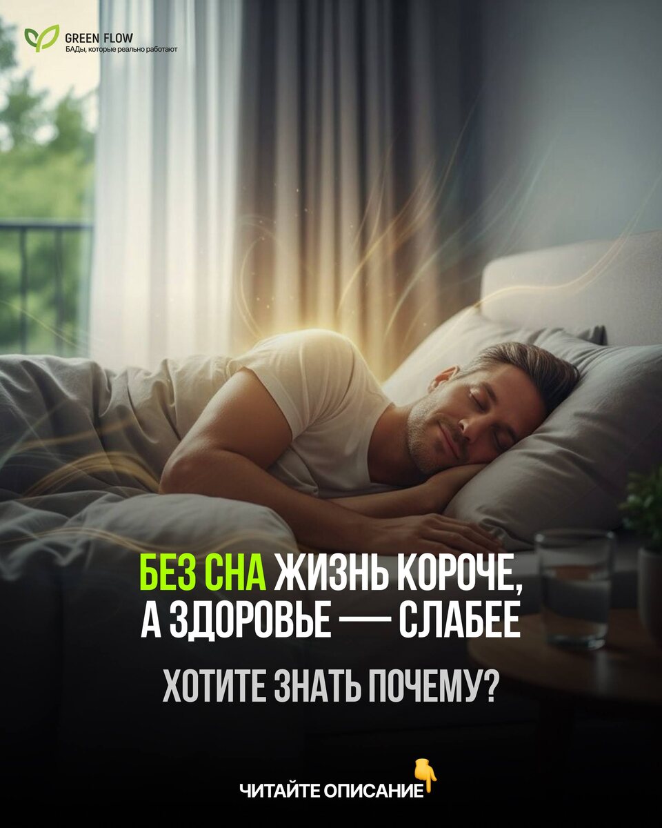 Вы можете пить витамины, заниматься спортом, правильно питаться – но если спите 5 часов, всё это бесполезно! Сон – это не отдых. Это перезагрузка. Во время сна восстанавливаются мышцы, даже если вы не тренировались. Мозг очищается от токсинов и бета-амилоидов, которые вызывают деменцию. Синтезируются гормоны молодости — соматотропин и мелатонин. Консолидируется память, и вы учитесь. Регулируется аппетит, и без сна вы переедаете на 30%. Одна ночь без сна и ваш иммунитет падает на 70%. Неделя плохого сна – и вы стареете на месяцы. Биохакеры знают: качественный сон работает лучше, чем любой БАД. Спите 7-9 часов. Это не роскошь – это инвестиция в здоровье! GREENFLOW.LIFE