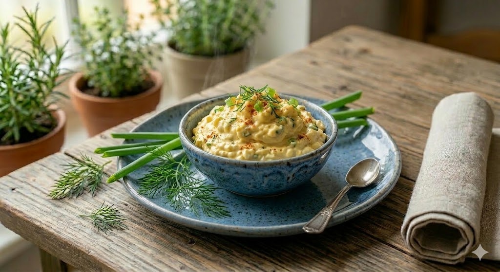 Этот салат идеально намазывать на поджаренный хлеб или гренку. «Если желток у ваших яиц получился с сероватым ободком (переварили), не переживайте! При фаршировании добавьте в начинку немного куркумы или яркой горчицы — это вернет массе аппетитный золотистый цвет».