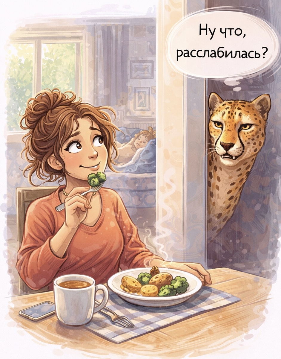 Потому что мой обычный режим это: быстро поела, иногда стоя, между «мам, смотри» и детскими истериками.