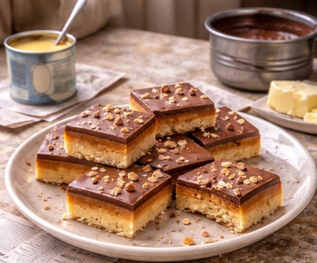 Этот рецепт я однажды записала с телевизора — шла какая-то кулинарная передача, я гладила бельё и вполуха слушала. А потом ведущий разломил готовое печенье, показал крупным планом: хрупкое песочное дно, карамельная прослойка, шоколадная глазурь с орешками — и я бросила утюг. Побежала за ручкой, нацарапала на квитанции за электричество. Двадцать лет пеку, и ни разу не подвело. Стакан муки просеиваю в глубокую миску. Сто двадцать граммов сливочного масла — холодного, прямо из морозилки — режу кубиками и перетираю с мукой пальцами, пока не получится рыхлая крупка, похожая на лапшу. Четыре столовых ложки коричневого сахара, быстро замешиваю тесто. Квадратную форму — двадцать три на двадцать три сантиметра — застилаю пергаментом, распределяю тесто по дну ровным слоем и прокалываю вилкой, чтобы не вздулось. Духовка разогрета до ста восьмидесяти — пятнадцать-двадцать минут, пока корж не зарумянится. Остывает прямо в форме. А теперь — карамель, ради которой всё затевалось. В кастрюльку с антип