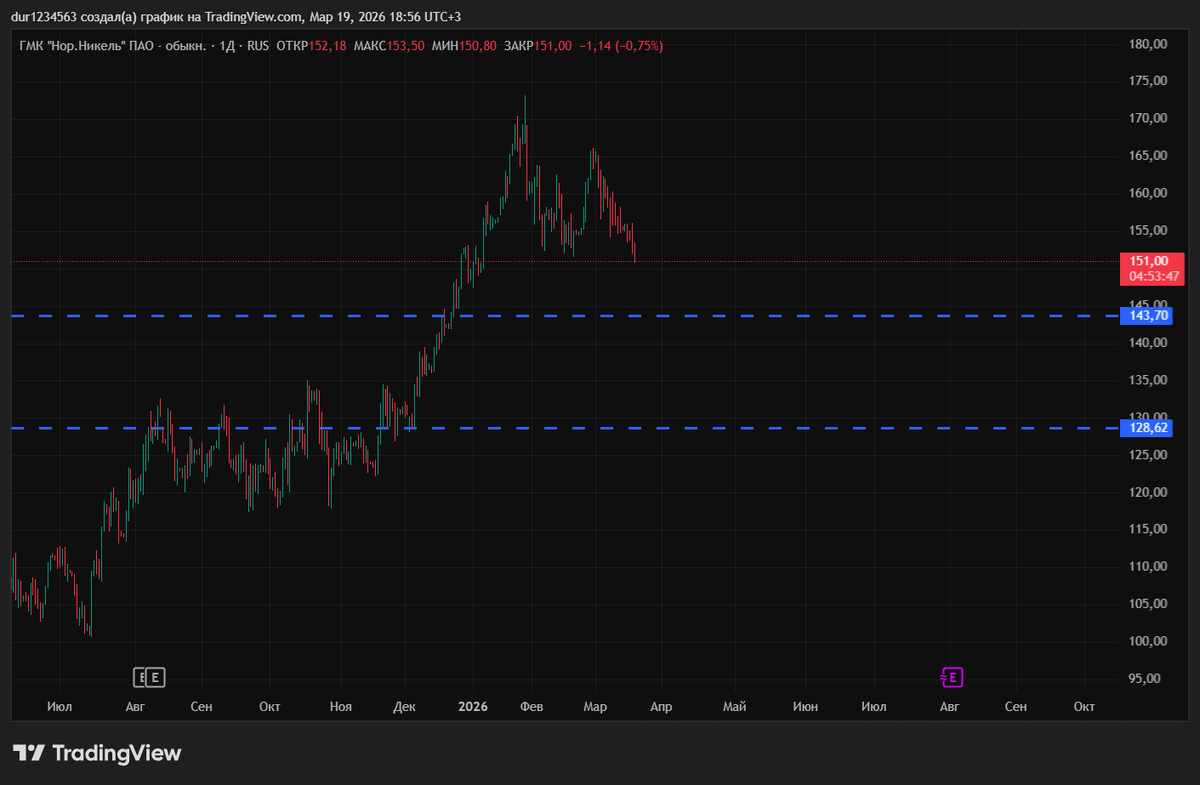 Ранее я отмечал, что после стремительного ралли акциям ГМК «Норникель» необходима техническая передышка. Рынок подтвердил этот анализ: котировки, выросшие за 96 дней с 117,80 до 170,46 рубля (+44,7%), действительно скорректировались. На текущий момент цена опустилась примерно на 11% и торгуется в районе 151–154 рублей. Это не падение компании, а закономерная фиксация прибыли инвесторами на фоне отсутствия дивидендов за 2025 год и снижения прогноза по производству палладия. Ситуация развивается ровно так, как предполагалось в предыдущем анализе. Сейчас акции находятся в ожидаемом ценовом коридоре 166 – 151 рубль. Цена вплотную подошла к моей зоне интереса для возможной докупки. Почему я сохраняю спокойствие и уверенность? Потому что действия были предприняты заранее: Такой подход позволяет минимизировать риски и оставаться в рынке независимо от краткосрочных шумов. Важно смотреть на факты, а не на эмоции. Компания сохраняет сильные позиции в сегменте никеля для электромобилей, и текущая