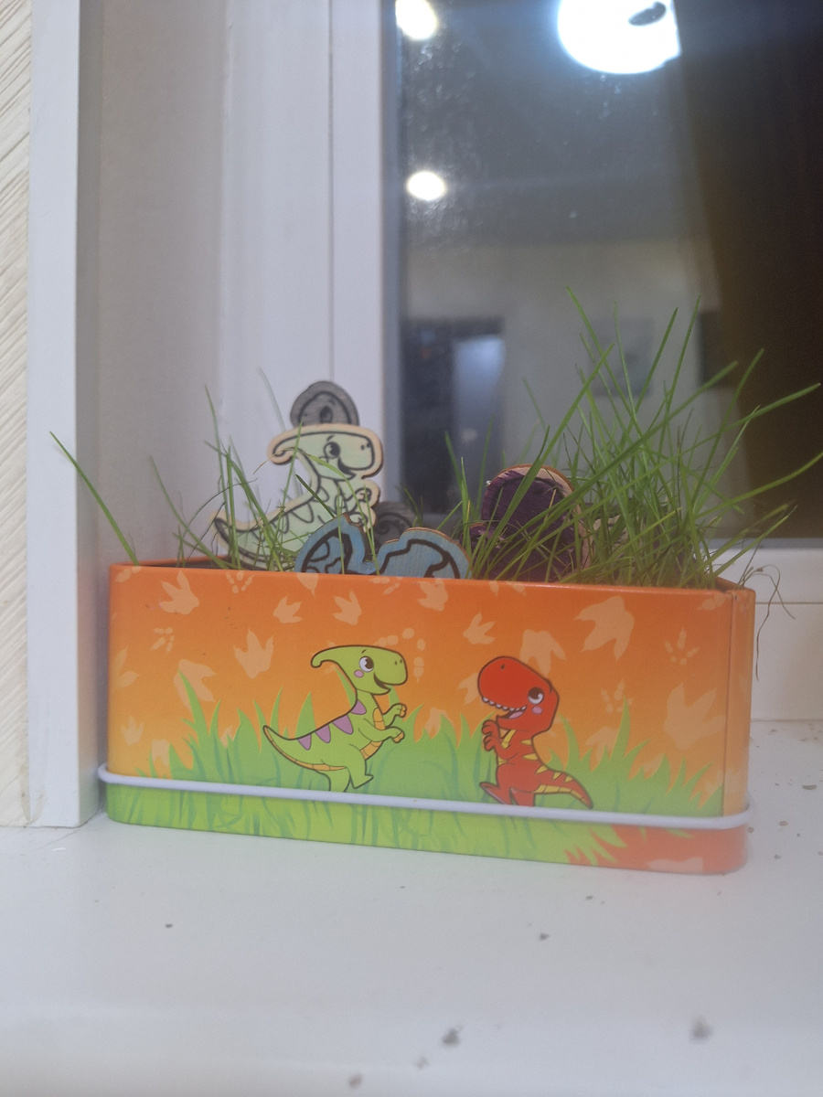 🌿Набор для выращивания травки. Их много разных, у нас коробка «Мой мини-сад» с двумя видами семян, набором деревянных динозавров и красками. Сначала высаживали траву, после раскрашивали динозавров и расставляли их охранять сад. Так как засыпали толстым слоем почвы, трава показалась на
