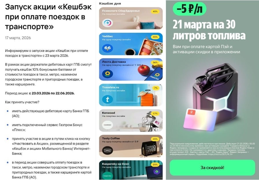 💳#ГПБ Клиентам с подключенным сервисом Газпром Бонус «Плюс» обещает кэшбэк 10%, макс 150б/месяц при оплате картой банка с 23.03 по 22.06.26 поездок в такси, метро, наземном городском транспорте и пригородных поездах, а также каршеринге (МСС 3990–3992, 4111, 4121, 4131, 4789, 7512). Плюс должен быть подключен до активации акции (путём нажатия на баннер в приложении). Начислениедополнительно к кэшбэку по ПЛ и сверх лимита. Правила. 2500₽ за дебетовку. 💳#ТБанк • Сегодня в кэшбэке дня может быть 🛒36%, макс 750 на 1 покупку от 1500₽ в Ленте Доставке; 🍽45%, макс 500 на 1 покупку в Чиббис и др. • БИТВА - кэшбэк 20%, макс 400 на первый заказ в Супермаркетах в Городе по 20.03.26 (остальные). 💳#Сбер 🛒 Сегодня #СберФест снова со скидками до 58% на товары в подборке Самоката (+промокоды). СберПрайм - 60 дней за 1₽ (4 чел) / Детская +1000₽ / Молодёжная +500₽ / Кредитка 120 дней 💸#Яндекс В Дейли четверг с подарками. 💳#ТКБ С 26.03.26 снижает промо-ставки по НС ТКБ-Счёт: 14→13,5% годовых в