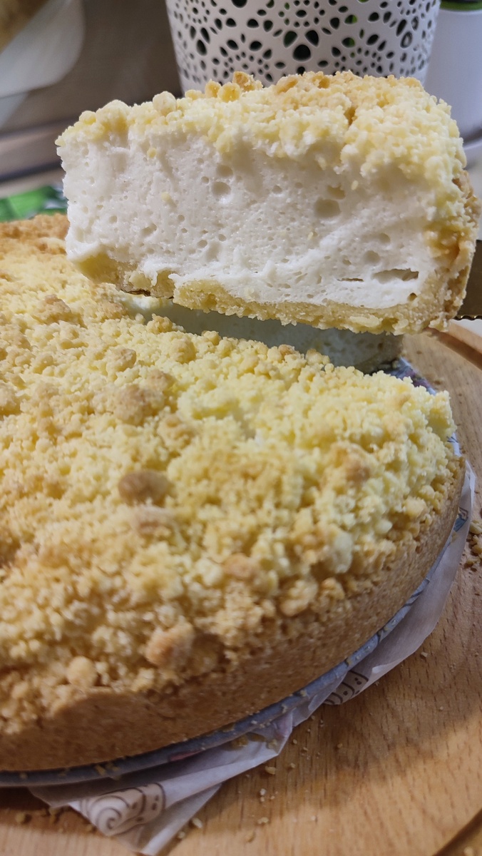 📖 Продукты для рецепта. Для теста: ✔ Желтки 3 шт ✔ Сахар 60 гр ✔ Растопленное сливочное масло 75 гр ✔ Мука 260-265 гр ✔ Соль щепотка ✔ Разрыхлитель 5 гр Для начинки: ✔ Белки 3 шт ✔ Соль щепотка ✔ Сахар 90 гр ✔ Греческий йогурт 350 гр ✔ Крахмал 37 гр 1. Для теста в чаше соединяем желтки, соль и сахар. Хорошо перемешаем венчиком. На этом этапе не нужно добиваться чтобы сахар растворился. 2. Теперь добавляем растопленное сливочное масло и перемешиваем. Всыпаем муку, разрыхлитель и замешиваем тесто вилкой, до получения однородной крошки. 3. Берем форму 22 см в диаметре, низ выстилаем пергаментом и высыпаем 2/3 части крошки. Формируем дно и бортики. 4. Для начинки в глубокой чаше соединяем белки и соль, начинаем взбивать на низких оборотах, постепенно добавляя их и всыпая сахар. Взбиваем до устойчивых пиков. 5. Всыпаем крахмал и добавляем греческий йогурт. Вмешиваем их в белки на самых низких оборотах миксера или можно использовать лопатку (если долго использовать на этом этапе миксер бел
