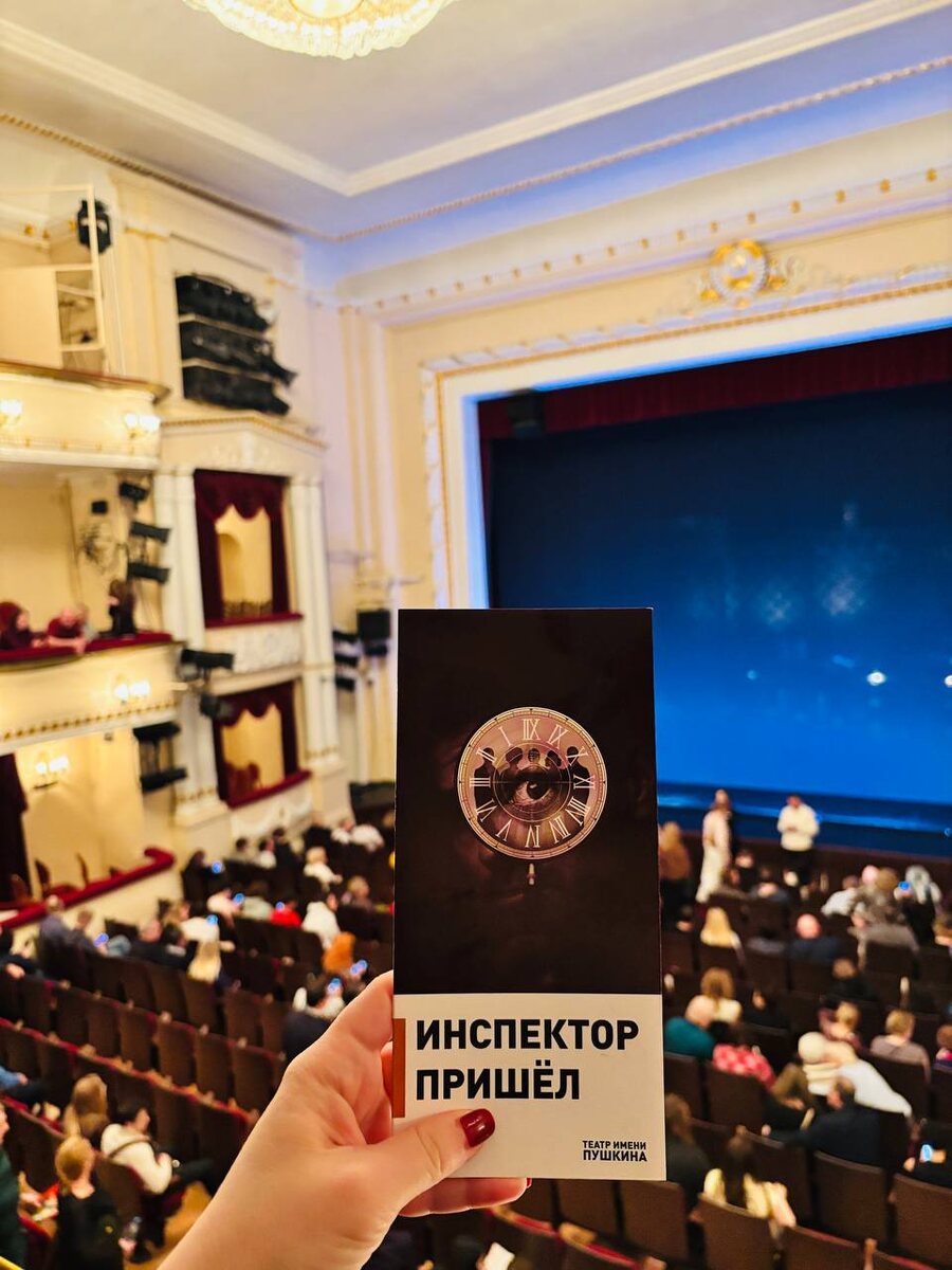 И снова я в Театре Пушкина, теперь на спектакте по детективной пьесе Джона Бойнтона Пристли«Инспектор пришел». Интересный факт, что впервые эта пьеса была поставлена не на родине автора, а в Камерном театре Александра Таирова в 1945 г. Получается, Театр Пушкина продолжает преемственность, и постановка снова заиграла в этих стенах, только теперь уже под художественным руководством Евгения Писарева в режиссуре Олега Пышненко.