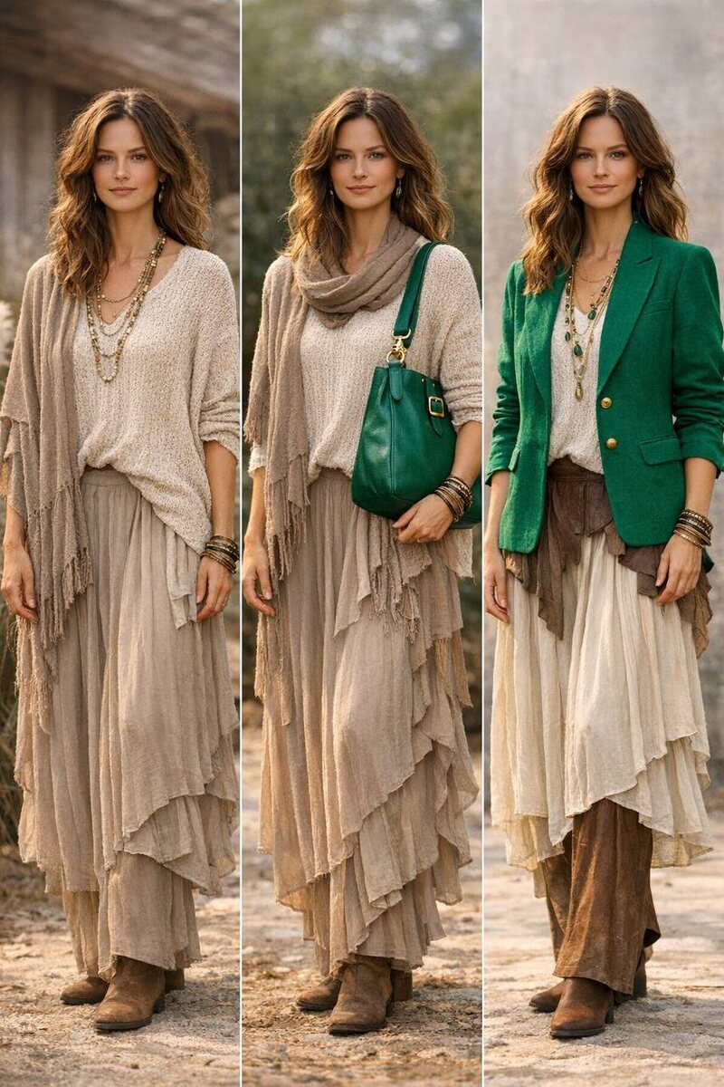 Я часто слышу: «Мне нравится яркое, но я не решаюсь». И это нормально. Переход к цвету — это не про резкий скачок. Это про постепенное расширение себя. Вот несколько мягких способов начать. 1. Начните с акцента Не обязательно сразу покупать яркое платье. Попробуйте: ➖шарф фуксии ➖изумрудную сумку ➖кобальтовые серьги ➖яркий пояс Цвет в аксессуарах — самый безопасный способ выйти из зоны бежевой стабильности. 2. Оставьте силуэт привычным Если вы любите текучие бохо-формы — не меняйте их. Добавьте цвет, но сохраните комфортный крой. Например: любимая юбка — но в более насыщённом оттенке. или привычный жакет — но кобальтовый вместо нейтрального. Форма остаётся — меняется энергия. 3. Используйте правило одного яркого элемента В образе пусть будет только один «говорящий» цвет. Остальное — спокойная база. Так яркость не перегружает, а работает акцентом. 4. Выбирайте глубокие оттенки Если сложно с неоном — выбирайте сложные, благородные цвета: ➖изумруд ➖винный ➖тёмный фиолетовый ➖глубокий