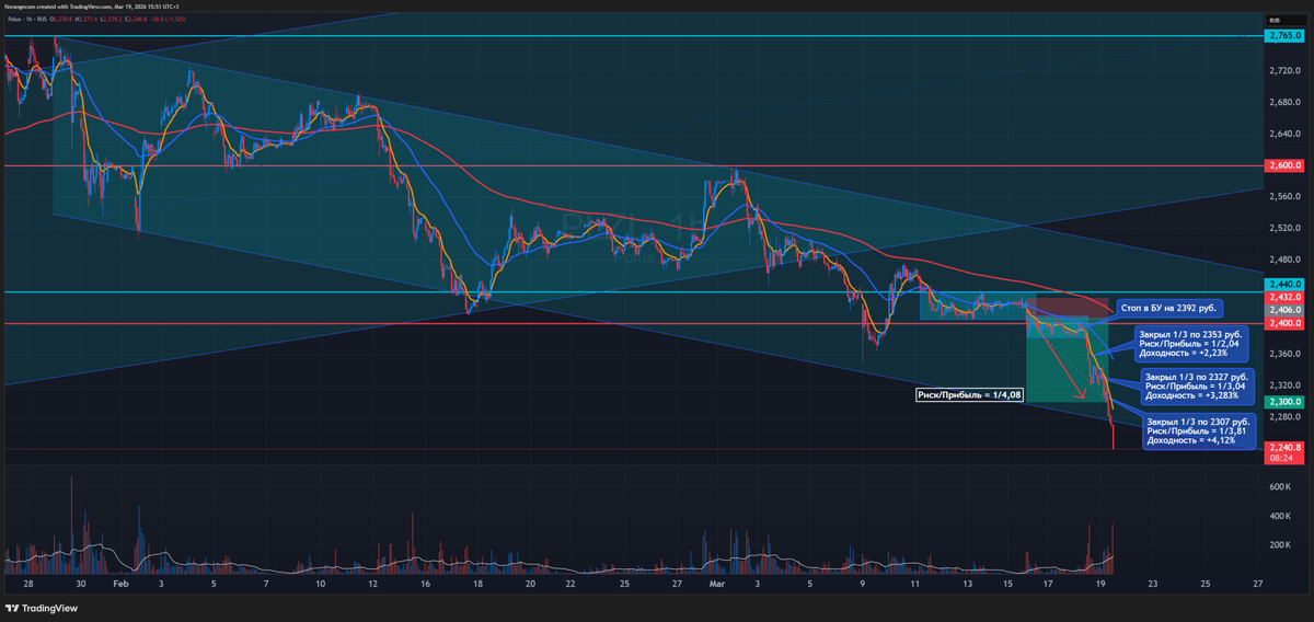 Сегодня был день отличных трейдов! С утра полностью закрыл вблизи цели шорт в акциях #PLZL. Конечно, немного не додержал: буквально через пару часов после закрытия начали падать цветные металлы, и котировки Полюса ушли существенно ниже моей цели – до 2240 руб. Подробный разбор этой сделки сделал в предыдущем посте – рекомендую прочитать тем, кто хочет перенять мой опыт. В общем, мог бы высидеть соотношение риск/прибыль 1 к 6,4. Сейчас моя задача – выработать железную дисциплину удержания прибыльных позиций до целей. Следующий этап, оставлять 10–30% позиции «на вырост», чтобы забирать дополнительные 1–2R сверх плана. Кроме того, сегодня по тейку закрыл лонг в акциях #LENT по 2299 руб. В последний момент, перед уходом на тренировку, сдвинул тейк на рубль ниже, переживая, что в зале может не быть связи. В итоге забрал отличное соотношение риск/прибыль 1 к 4,53. Таким образом, на двух сделках чистая прибыль в спекулятивном портфеле составила +263 724 руб. из возможных 345 180 руб., если бы