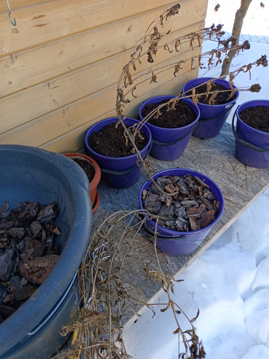 Вытащил цветочные вёдра-горшки. Из теплицы. Сухую ботву срезаю. Мульчу, в виде сосновой коры, изымаю. Корни вытаскиваю. Рыхлю. Горшочки готовы к новым посадкам.