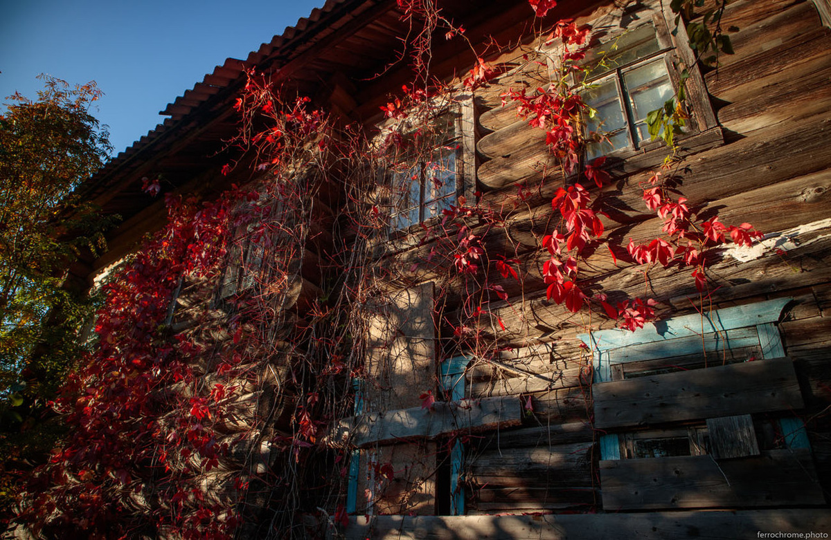 История этого места началась четыреста лет назад, а закончилась тем, что здесь не осталось ни одного жителя. Часть домов разрушились и утонули в зарослях метровых трав вперемешку с малинником, а оставшиеся двухэтажные гиганты взирают на дорогу мёртвыми окнами. На обочине - давным-давно закрытый магазин. В 2010 году здесь насчитывалось 4 жителя, сегодня же не осталось никого. Один из домов особенно привлёк наше внимание - он возвышался в заброшенном яблоневом саду, а его стены были густо оплетены огненно-красными вьющимися растениями. Всё это выглядело крайне живописно, как настоящий домик из сказки. Домик из сказки оказался не только самым живописным, но и самым целым. Нас встречает старинный стол и более-менее уютная обстановка. В теории, здесь до сих пор можно жить. Следующий интересный дом богато декорирован разнообразной резьбой. Увы, внутри он сильно разобран, не осталось даже полов. А остальные дома поменьше и попроще. Вечереет. Мы покидаем сие место, отправляясь в дальнюю дорогу