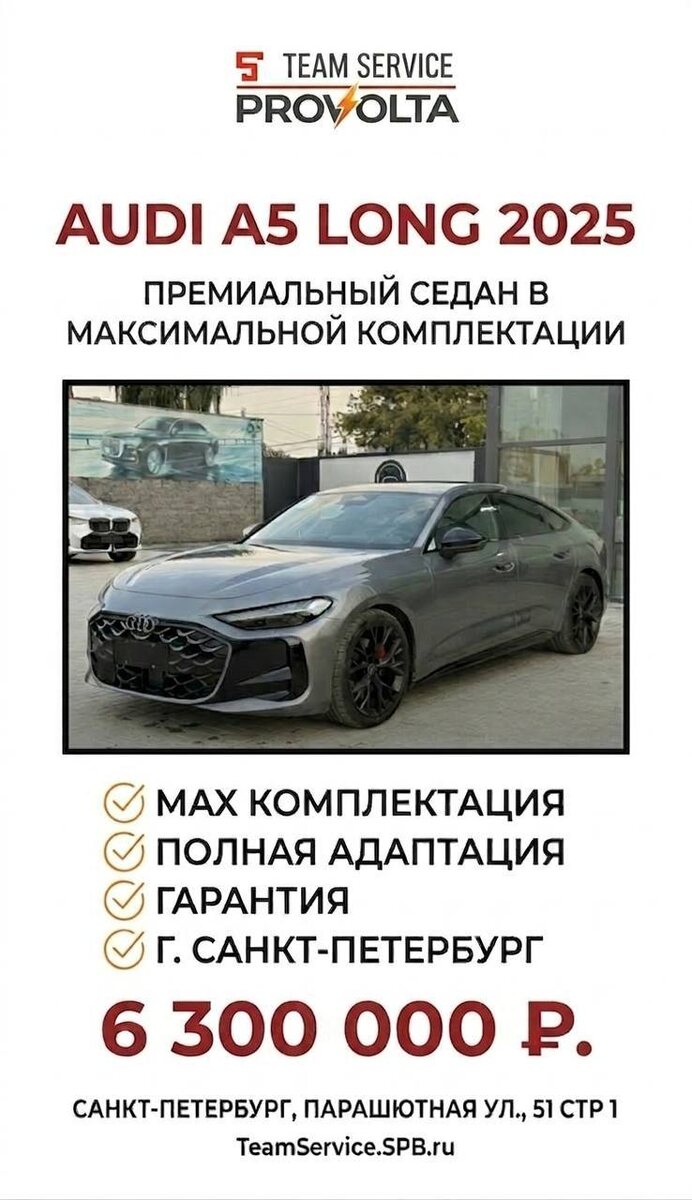 🇩🇪 Мы знаем всё о том, как спасать и обслуживать премиальные автомобили. И именно поэтому мы знаем, как их правильно выбирать и привозить. Прямо сейчас в Санкт-Петербурге своего владельца ждет роскошный лифтбэк: Audi A5 Long (2025 года) в потрясающем сером цвете. Это не просто красивый кузов, это автомобиль, в котором мы уверены на 100%. Что вы получаете: ✔️ Статус «В наличии» - приехал, увидел, забрал. ✔️ Комплектация MAX - максимум технологий и бескомпромиссный комфорт. ✔️ Полная адаптация - мы уже обо всем позаботились. Никаких «иероглифов» и сбоев в ПО, электроника работает в штатном режиме. ✔️ Гарантия - ваша безопасность и спокойствие на дороге. 💰 Стоимость: 6 300 000 ₽ Ищете что-то другое? Для нас нет нерешаемых задач. В PROVOLTA & TEAM SERVICE мы можем привезти абсолютно любой автомобиль под ваш личный запрос. 🧐 Как вы считаете: лучше забрать готовый, полностью адаптированный автомобиль из наличия - или подождать доставку, но собрать уникальную комплектацию под себя