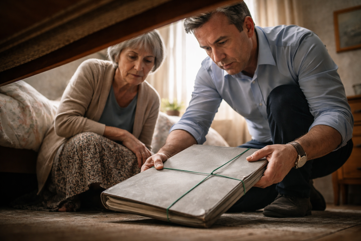 Глеб опустился на корточки. Колени сразу стали серыми. Он не тянулся к папке несколько долгих секунд, будто надеялся, что ошибся и это просто похожий картон. Раиса стояла у тумбочки, держась за её край. В комнате стало так тихо, что было слышно, как за стеной кто-то передвигает чашку по столу.