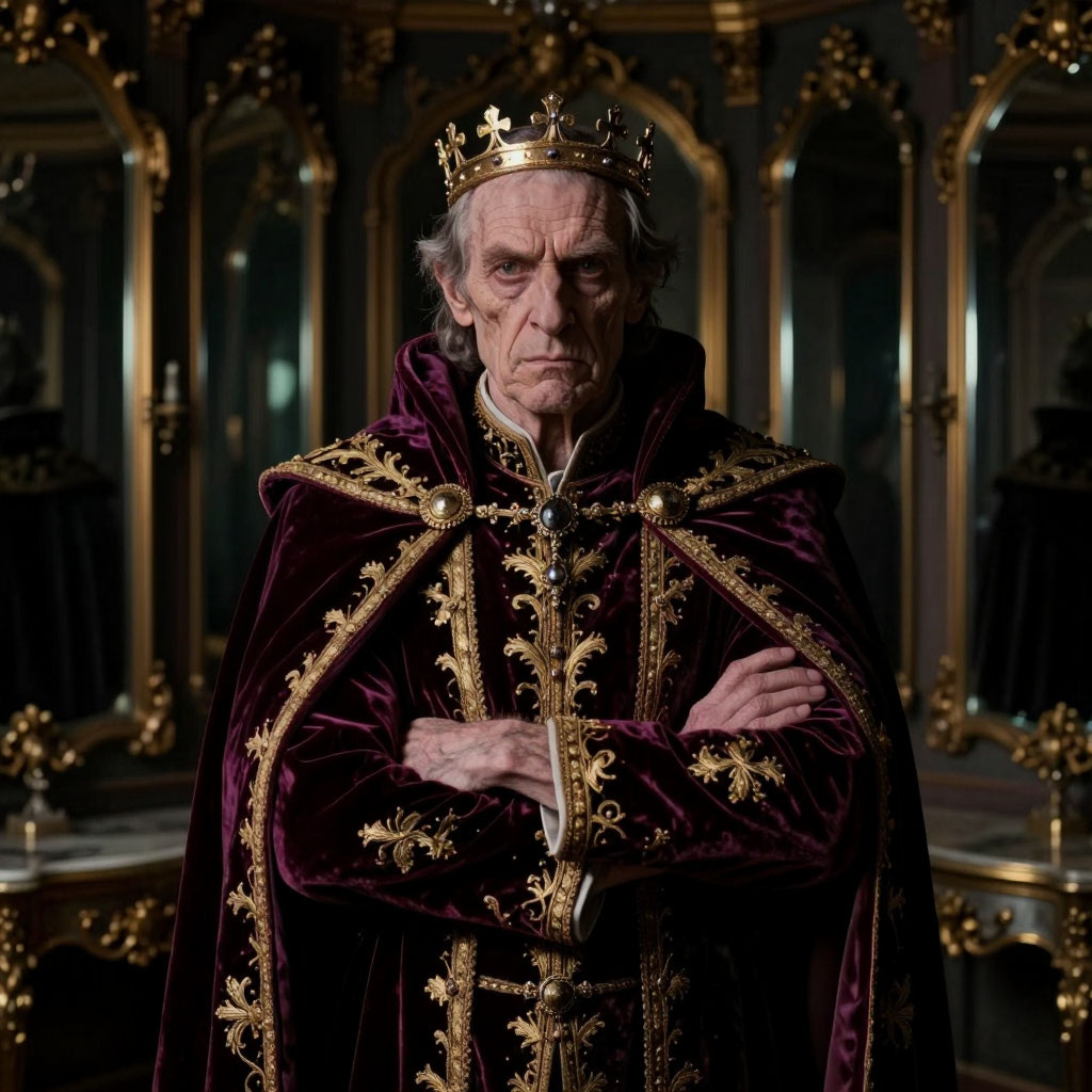 Но внутри у него что-то кольнуло. Впервые его отвергли. Это было невыносимо. Чтобы заглушить боль, он пошел в тронный зал — смотреться в любимое зеркало. Но зеркало вдруг показало его... обычным. Слегка осунувшимся, с мелкими морщинками.