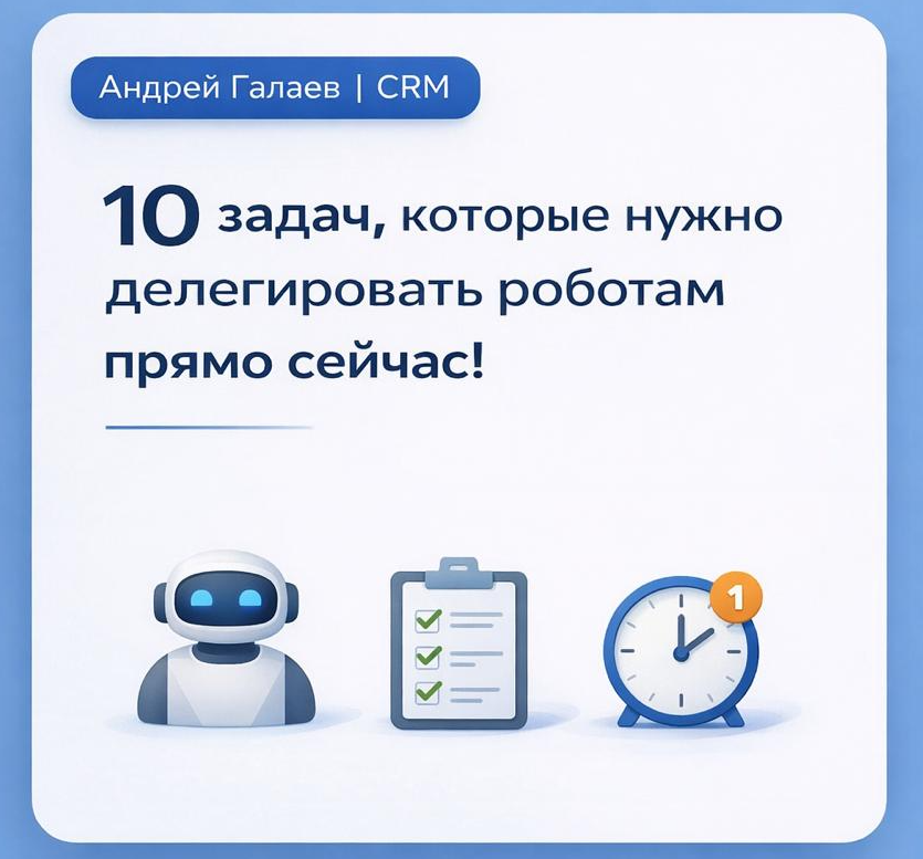 Привет! Это Андрей, я занимаюсь внедрением CRM-систем уже больше 12 лет и помогаю владельцам бизнеса экономить самый дорогой ресурс — время. Знаешь, что меня всегда удивляет? Когда люди с зарплатой в 200-300 тысяч часами выполняют работу, которую можно автоматизировать за копейки. Это как ездить на Ferrari и собирать по дороге пустые бутылки — нелепо и дорого. Я подсчитал: правильная автоматизация рутины экономит в среднем 45 часов в месяц. Это почти неделя работы! Рассказываю, какие задачи пора перестать делать руками и отдать умным системам. Клиент оставил заявку на сайте, а потом ждал ответа три дня? Поздравляю, он уже купил у конкурента. Что делает робот: Раньше на это уходило по 15-20 минут на каждого клиента. Умножь на количество заявок — и поймешь масштаб экономии. Что делает робот: Один мой клиент таким образом освободил своего менеджера от 2 часов монотонной работы в день! Забыл о встрече или перепутал время? Это непрофессионально и бьёт по карману. Что делает робот: Что дела