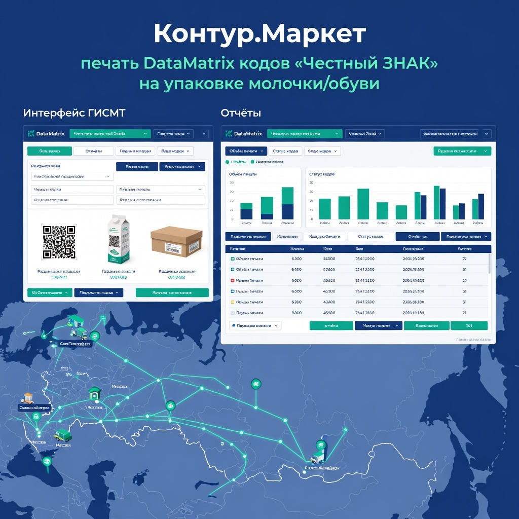 Контур.Маркет обеспечивает 100% соответствие системе Честный ЗНАК для 30+ товарных групп: обувь, молочная продукция, табак, лекарства, шины, парфюмерия, воду и велосипеды с 2026 года. Сервис генерирует уникальные коды DataMatrix, автоматически вводит товары в оборот, формирует универсальные передаточные документы и синхронизирует данные с ГИСМТ каждые 30 минут. Это предотвращает штрафы до 300 тысяч рублей по статье 15.12 КоАП и до 1 миллиона для юрлиц. Полмиллиона производителей по России уже используют решение, обработав свыше 50 миллиардов кодов без единого сбоя. Система поддерживает автогенерацию кодов с привязкой к SKU, печать на этикетках через принтеры Zebra или Godex прямо из интерфейса, интеграцию с весами и конвейерами для массового производства. Мониторинг полного жизненного цикла товара включает ввод в оборот, вывод, возврат и утилизацию с трекингом по всей РФ. Аналитика показывает остатки, просрочки и точки риска, а электронный архив хранит документы 10 лет с поиском по ИНН