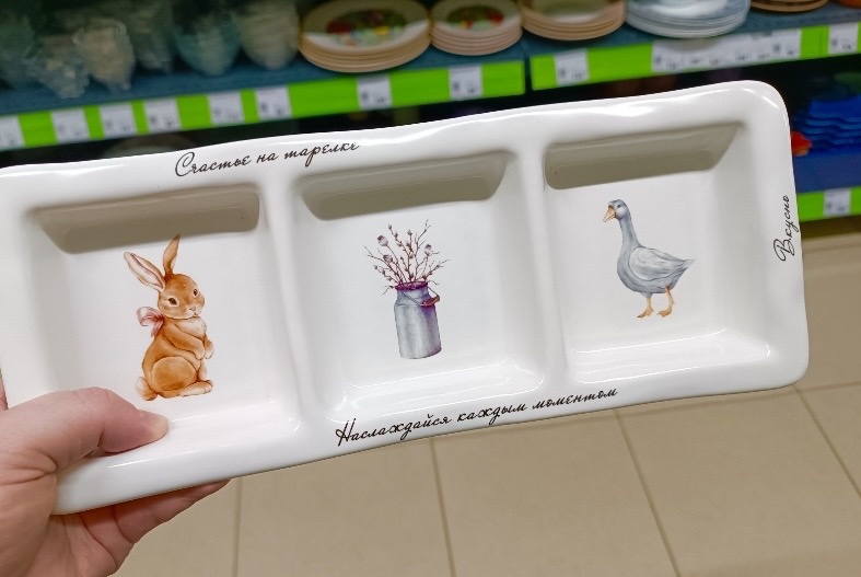 Очень понравились менажницы из керамики. 3 отделения. Красивый декор. Имеются надписи. Размер 30х12 см.
