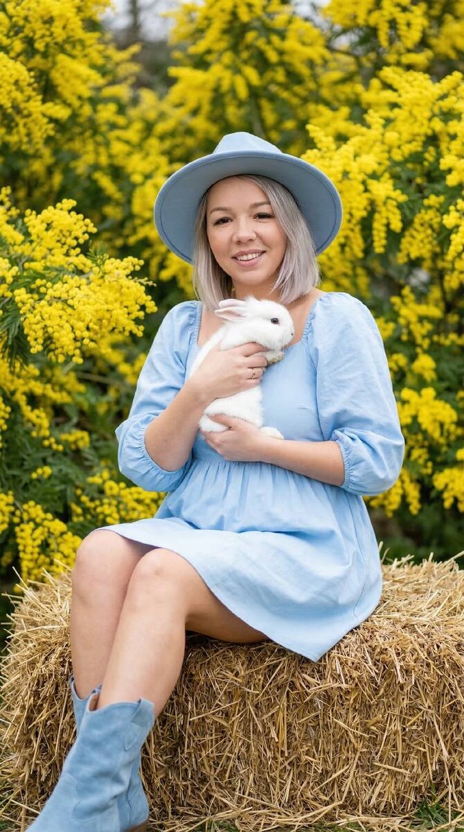 1️⃣Переходим на удобный сервис для генерации: 👉 Syntx Ai 👉 Veo3 2️⃣Выбираем дизайн ИИ/создать картинку 3️⃣Nano banana pro🍌 4️⃣Загружаем свое фото и промпт 📌ВИДЕОИНСТРУКЦИЯ ПО ИСПОЛЬЗОВАНИЮ В ЗАКРЕПЛЕННЫХ СООБЩЕНИЯХ 👍👍👍👍👍👍 ⚠️ПОДПИШИСЬ НА РЕЗЕРВНЫЕ КАНАЛЫ 👇 📱 канал в ВК 📱 канал в МАХ ◾️ПРОМПТ : Ультрареалистичный весенний портрет в стиле лайфстайл, вертикальный снимок в полный рост. Красивая улыбающаяся девушка с фото сидит на сухом золотистом сене, нежно прижимая к груди маленького пушистого белого кролика. Не меняй черты лица. Волосы цветом как на фото, короткие, но густые. На ней монохромный пастельно-голубой наряд: широкополая фетровая шляпа, короткое платье в крестьянском стиле с пышными рукавами 3/4 и замшевые ковбойские сапоги. Сияющий естественный макияж, яркая счастливая улыбка. Она окружена пышными, ярко-желтыми кустами мимозы. Мягкий, рассеянный естественный дневной свет, воздушная коммерческая эстетика, без резких теней. Цветовая палитра преимуществ