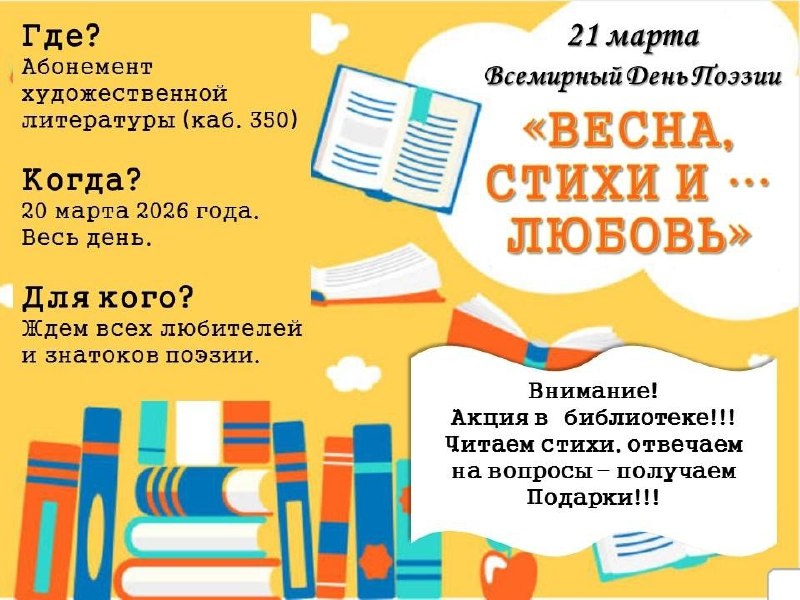 Акция для любителей поэзии с чтением стихов о весне и любви, ответами на вопросы и подарками. Мероприятие проходит в абонементе художественной литературы. Начало: 21 марта 2026 10:00 Стоимость: Не указана Адрес: г Омск, пр-кт Комарова, д 7 Организатор: https://vk.com/public204964284 21 МАРТА – ВСЕМИРНЫЙ ДЕНЬ ПОЭЗИИ. АКЦИЯ: «ВЕСНА, СТИХИ И … ЛЮБОВЬ»🌞🌈💦 ‼‼‼Внимание! Внимание! Внимание! ✍21 марта отмечается Всемирный день поэзии! Учрежден он был для того, чтобы, согласно резолюции ЮНЕСКО, «поддержать языковое разнообразие посредством поэтического самовыражения и дать возможность языкам, находящимся под угрозой исчезновения, быть услышанными». 📖🎙В этот день мы открываем двери в мир стихов и рифм! 🗣🗣Читайте свои любимые стихи о весне, любви и, вообще, обо... #искусство_и_дизайн_поэзия Узнать подробности, адрес или записаться на событие.