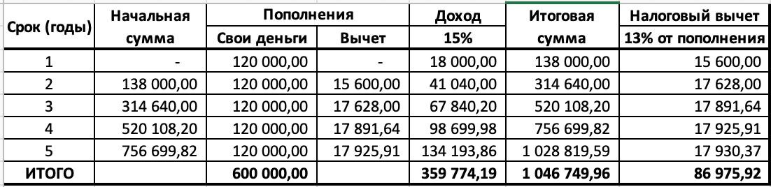 ? Инвестиционный вычет - мой самый любимый😍 Потому что это единственный налоговый вычет, при котором деньги не тратятся, а остаются у вас. Так еще и 13% можно получить от государства. Причем это работает на любых суммах, для этого не нужно сразу 400 тыс выкладывать. Покажу на примере клуба #КлубАндреяКулаги ✅ Сумма инвестиций ~2 тыс в неделю. За год получается 120 тыс своих вложений ✅Налоговый вычет 13% от суммы пополнения (реинвестируем и снова направляем в инвестиции) ✅Средняя доходность 15% (берем не самую большую). ✅ Если так делать каждый год, то через 5 лет у вас на счету будет 1 046 750 рублей! ❗️Без ИИС сумма была бы 930 тыс (на 116 тыс меньше). ‼️А если возьмем с такими же условиями, но банковские вклады с их средней доходностью 8%, то сумма окажется еще меньше - 760 тыс. А если хочется получить максимальный вычет, то можно делать в клубе Х3. Тогда результат через 5 лет будет больше 3 млн рублей. Даже если у вас нет НДФЛ, чтобы получать 13% от суммы пополнения, ИИС