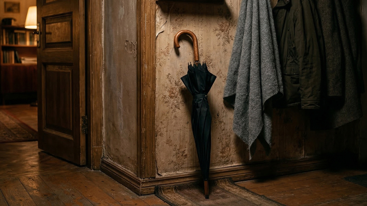 Зонт-трость. Мужской. Не складной – именно трость. Такие носят те, кто привык к ним с молодости. Я знала одного такого человека в этом доме. Стрельцов. Геннадий Фёдорович. У него был точно такой же – чёрный, тяжёлый, с деревянной ручкой. Он ходил с ним в любую погоду – и в дождь, и в сухую. После того как три года назад его хватил удар, трость сменилась на обычную палку. Но прежнюю я запомнила.