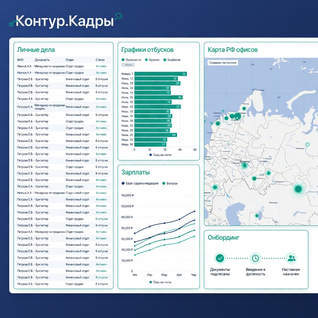 Контур.Кадры автоматизирует полный цикл управления персоналом: от подбора до увольнения, для 1-5000 сотрудников. Электронные трудовые книжки, унифицированные формы Т2, Т3, РСВ, расчет отпусков/больничных по ТК РФ. Интеграция с 1С ЗУП, Госуслуги, центрами занятости. 800 тысяч компаний РФ используют сервис. Они сократили бумаги на 95% и время HR на 70%. Доступ через браузер, мобильное app, ролевая модель безопасности. Система хранит личные дела в цифре с историей 10 лет. Она формирует приказы, графики смен, допсоглашения с ЭЦП. Автозаполнение РСВ, СЗВ-ТД, ЕФС-1 с подачей в СФР. Расчет среднедневного заработка для пособий. Аналитика текучки, эффективности, бюджет ЗП с прогнозом на квартал. Онбординг-планы для новичков, корпоративный чат, опросы satisfaction. Интеграция с HH.ru, SuperJob для подбора и HeadHunter Analytics для рынка зарплат. Регистрация на сайте, импортирует данные из Excel/1С ЗУП за час. Тест 14 дней. День второй - настройка штатного расписания, ролей, шаблонов документов