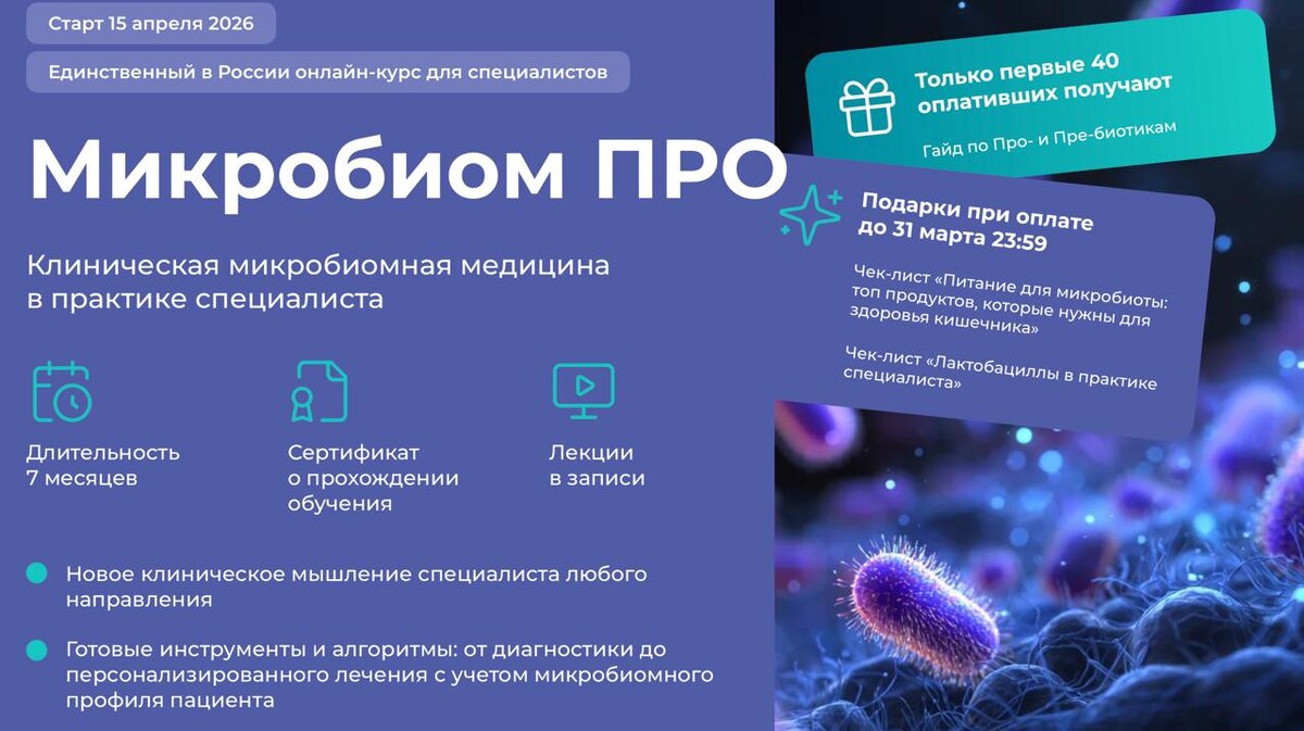 🔥 Встречаемся еще 26 марта на практическую лекцию в 18:00 по мск «Алгоритмы работы с микробиотой: воспаление, диагностика и клинические кейсы» Для тех, у кого не получилось быть на эфире, но кто уже очень хочет попасть на курс "Микробиом ПРО" Клиническая микробиомная медицина в практике специалиста ⚡️Я официально открываю продажи прямо сейчас Курс предназначен для практикующих специалистов: ✅Гастроэнтерологи ✅Гинекологи ✅Педиатры ✅Нутрициологи и диетологи ✅Дерматологи и косметологи ✅Стоматологи ✅Врачи превентивной и функциональной медицины ✅Специалисты Health & Wellness Чему вы научитесь во время обучения: 👉 Владеть клиническими алгоритмами: от диагностики (какой тест выбрать и как его интерпретировать) до персонализированного лечения с учетом микробиомного профиля пациента. 👉 Решать сложные случаи: научитесь работать с СИБР, резистентным дисбиозом, хроническими воспалительными состояниями кожи и кишечника, необъяснимой тревожностью и усталостью, а также со сложными пациентами с