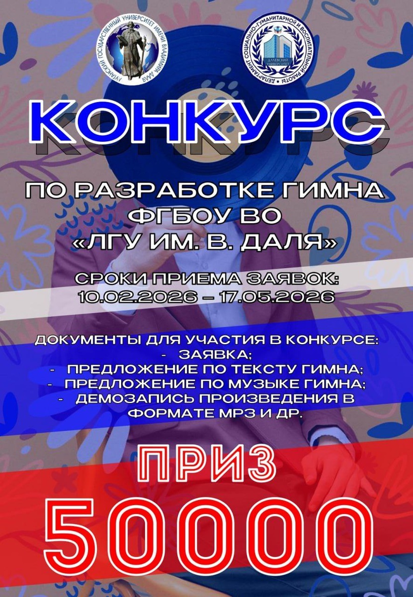В. Даля»! Хотите стать частью истории нашего университета? Примите участие в конкурсе и создайте гимн, который вдохновит будущие поколения! 📆 Сроки подачи заявок: 10 февраля 2026 г. – 17 мая 2026 г. 🔗 Адрес для отправки работ: vr.ovr@mail.ru 🎁 Призовой фонд: 50 000 рублей! Для участия подготовьте: 🤍 Заявку 🤍 Предложение по тексту гимна 🤍 Предложение по музыке гимна 🤍 Демозапись произведения в формате mp3 🤍 Согласие на обработку персональных данных (для сторонних лиц) 🔥Не упустите шанс проявить свою творческую энергию и оставить след в истории университета! Подробности смотрите в положении по конкурсу ⬇️ #НашЛГУ_Даль #ЛГУимДаля #КонкурсГимна #ДелайДобрыеДела #ГодЕдинстваНародовРоссии