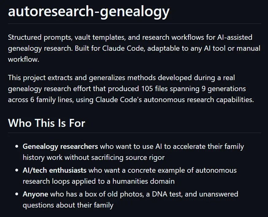 Нейросеть собирает родословную до 9 колена за одну сессию. Как ИИ лезет в архивы и находит предков. Среди ключевых решений и фактов: Нейросеть собирает родословную до 9 колена за одну сессию, обходя открытые архивы; Инструмент использует подход Андрея Карпаты и Claude Code для анализа свидетельств о рождении и церковных книг; В одном из кейсов ИИ нашёл девичью фамилию прабабушки, которую семья не знала 70 лет; На выходе — более 100 файлов с подтверждениями и ссылками на реальные архивы. Читать полностью