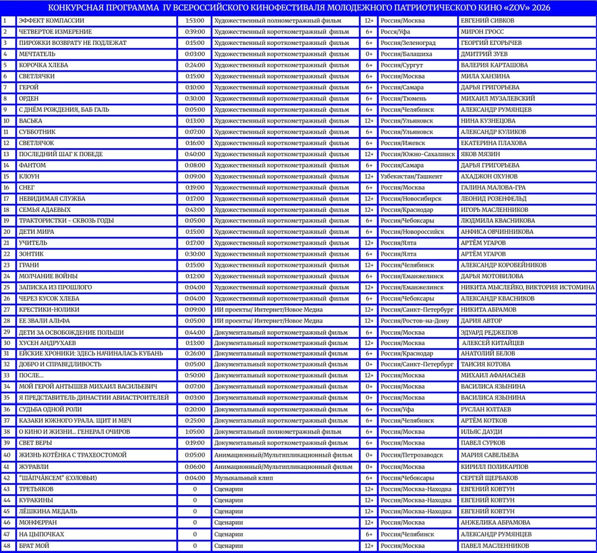 🎬🥳 Друзья, представляем вашему вниманию список участников конкурсного отбора IV Всероссийского фестиваля молодежного патриотического кино