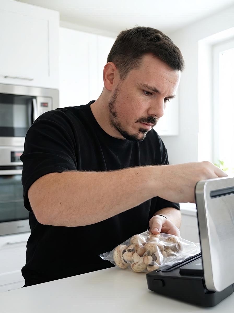 Рецепт простой. Режете шампиньоны пополам. Трете немного моркови для цвета. На 200 грамм грибов добавляете: столовую ложку соевого соуса, зубчик чеснока, ложку уксуса, ложку сахара, ложку масла. Секретный ингредиент — ложка бальзамического уксуса. Он дает густоту и сладость. Без него будет просто кисло. С ним — ресторанно. Добавляете паприку или чили. Кладете всё в пакет. Запаиваете. Включаете насос. Ждете десять минут. Открываете. Пробуете. Это готово. Вкус насыщенный. Как будто стояло в холодильнике три дня. Посыпаете кунжутом и зеленым луком. Подаете. Гости не верят, что это быстро. Вы не врете. Это правда. Магия физики.