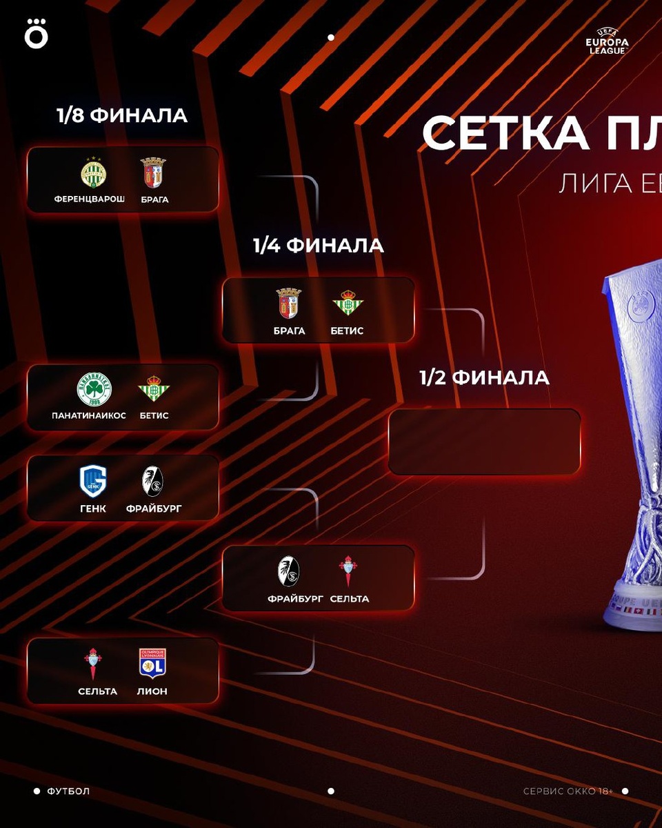 Изучаем 🏆 «Брага» — «Бетис» и «Фрайбург» — «Сельта» сыграют в левой части сетки, а «Порту» — «Ноттингем» и «Болонья» — «Астон Вилла» встретятся в правой части. Первые матчи пройдут 9 апреля, ответные игры состоятся 16 апреля. 😃 Смотри Okko прямо сейчас!