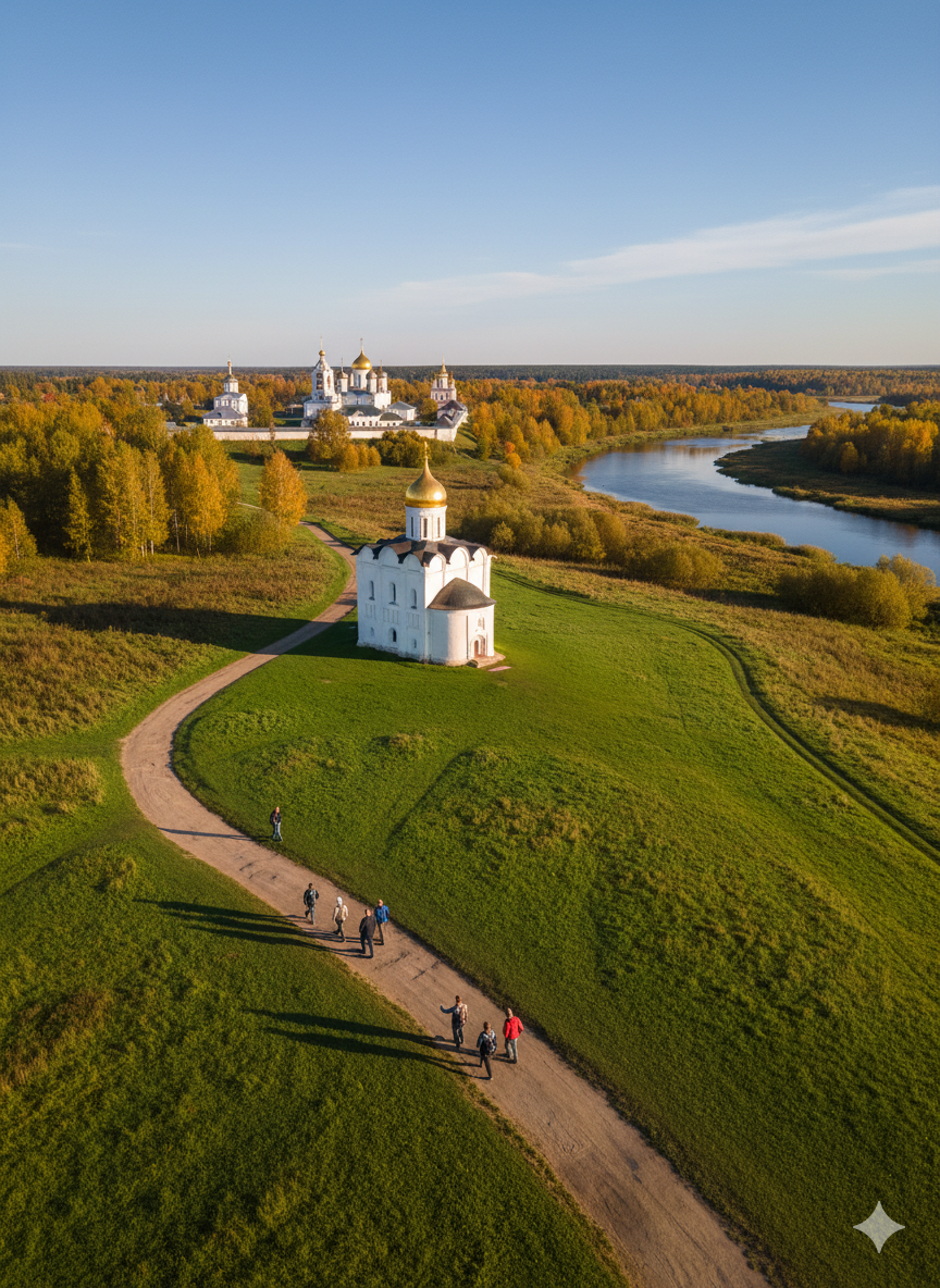 С моста открывается панорамный вид: с одной стороны — купола монастыря, с другой — бескрайний Боголюбовский луг и силуэт церкви Покрова вдали. Здесь удобно сделать первый снимок и спланировать маршрут. Именно отсюда начинается пешая тропа к храму Покрова на Нерли.