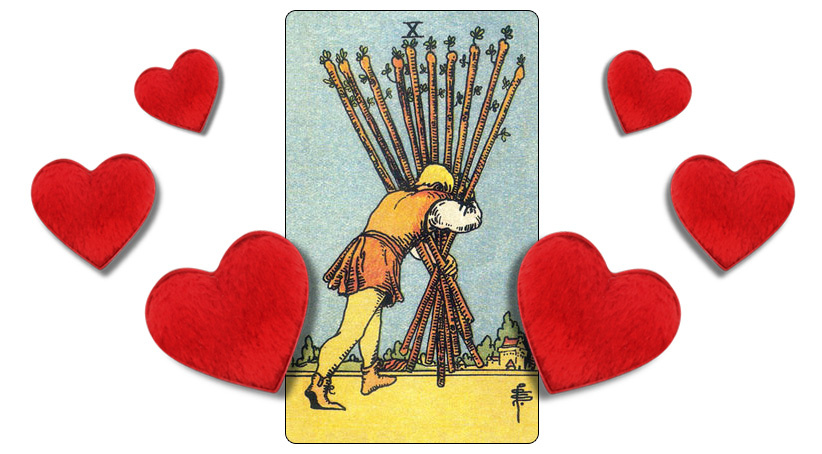 Десятка Жезлов – карта трудностей, неудобств, дискомфорта. Но она, на самом деле, не так плоха в вопросах, касающихся чувств и отношений. Вот посмотрим на примерах раскладов сейчас. По этой карте непросто отношения развиваются, но плюс в том, что они, по крайней мере, в принципе развиваются, идут вперед, хоть и тяжело приходится. Движение вперед есть. А немало ведь карт, где совсем никакого движения вперед нет. Двойка Мечей, к примеру. А то и вовсе откат назад (Восьмерка Кубков). Это положительные аспекты карты. Минус в том, что у спрашивающего нередко складывается впечатление, что он тянет отношения на себе, и что, если бросит тянуть, отношения сойдут на нет. В некоторых случаях, это действительно так. Но далеко не всегда. В любом случае Десятку Жезлов надо в рамках расклада трактовать, чтобы понятно было, что и куда развивается. Или не развивается. Посмотрим на примерах сейчас. Предположим, такой вот у нас расклад: Королева Кубков, Десятка Жезлов, Шестерка Пентаклей Тут по Королеве