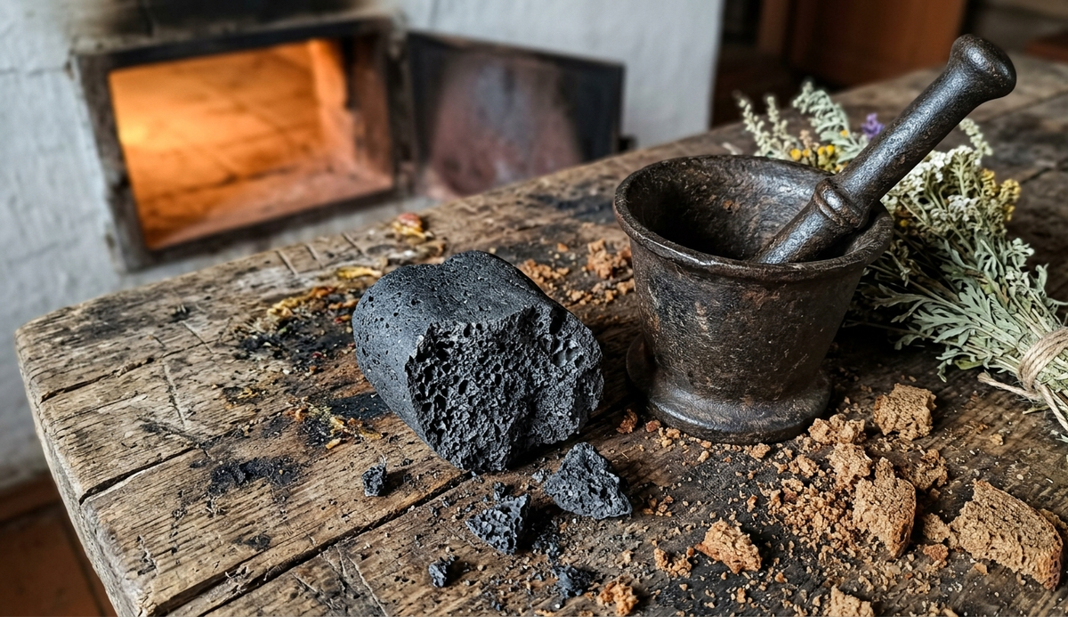 Когда через двенадцать часов печь остывала, из золы доставали черный, обугленный кусок. Его невозможно было разбить рукой — только тяжелым кованым пестом.