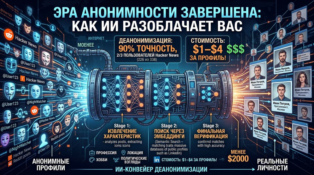 Недавнее исследование ETH Zurich и Anthropic поставило под вопрос саму концепцию анонимности в интернете. Оказалось, что большие языковые модели могут автоматически связывать псевдо аккаунты с реальными личностями — и это стоит всего от 1 до 4 долларов за профиль. Исследователи создали полностью автоматизированный конвейер на базе LLM, который работает в три этапа: 1. Извлечение характеристик личности. ИИ-агент анализирует анонимные посты пользователя и самостоятельно определяет профессию, местоположение, хобби и политические взгляды — всё, что можно «прочитать между строк». 2. Поиск кандидатов через семантические эмбеддинги. Система сопоставляет извлечённые данные с огромными базами открытых профилей, например LinkedIn. 3. Финальная верификация совпадений. Модель анализирует наиболее подходящих кандидатов, подтверждает совпадения и снижает количество ложных срабатываний. Учёные протестировали метод на пользователях Hacker News и Reddit. Из пула в 89 тысяч профилей LinkedIn система усп