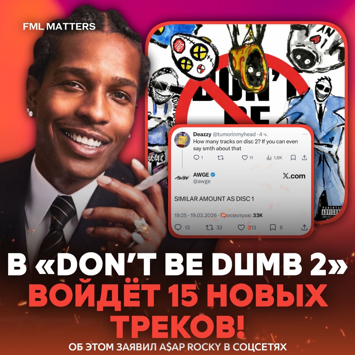 ‼️ 15 НОВЫХ ТРЕКОВ В «DON’T BE DUMB 2» ОТ A$AP ROCKY! Рэпер ответил фанату в соцсетях, который спросил, сколько треков будет на втором диске: «Примерно столько же, сколько на первом». Учитывая, что оригинальный альбом содержал 15 треков, можно ожидать около 15 новых композиций. Сможет удивить? ❤️🔥/👎 💀 FML MATTERS