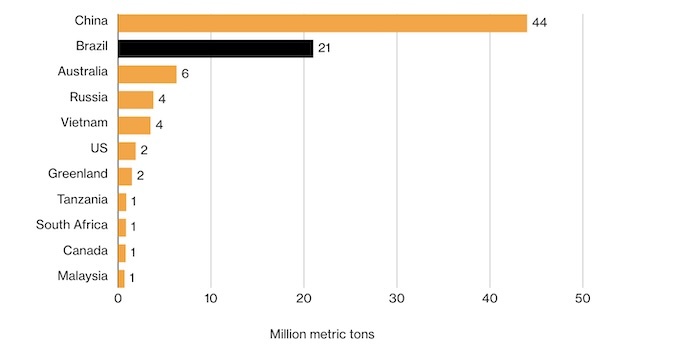 По данным Геологической службы США, в прошлом году объем добычи в Бразилии составил всего 2 000 тонн, что сделало ее девятым по величине производителем в мире. Китай для сравнения произвел 270 000 тонн и обеспечил более 60% мирового производства.