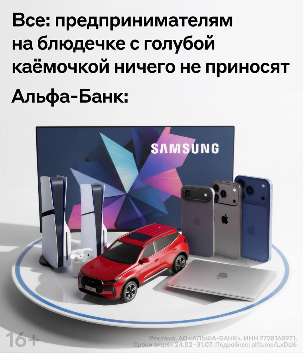 Раздают автомобиль TENET T4, iPhone 17, MacBook Air и множество других полезностей для бизнеса. Запоминайте: открываете счёт для бизнеса и оплачиваете покупку от 1000 рублей бизнес-картой до 29 марта. Затем — с 6 по 12 апреля идёте в приложение или Альфа-Бизнес Онлайн, ищите раздел Альфа-Выгодно и крутите там колесо призов. Готово, выигрыш уже у вас.[Подпишитесь на канал @oooasts](https://t.me/vsprose)